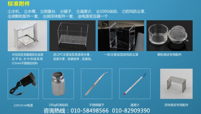 | 標(biāo)準(zhǔn)附件 | ①主機(jī)、②水槽、③測量臺、④鑷子、⑤溫度計、⑥砝碼、⑦防風(fēng)防塵罩、⑧測顆粒配件一套、⑨測浮體配件一套、⑩電源變壓器一個 | ||